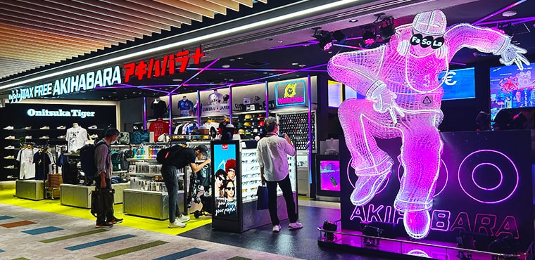 ネオンに囲まれた煌びやかな空間と豊富な品揃えで皆様を心からお待ちしております。ご出発前のお買い物と楽しいひと時をお過ごしください。