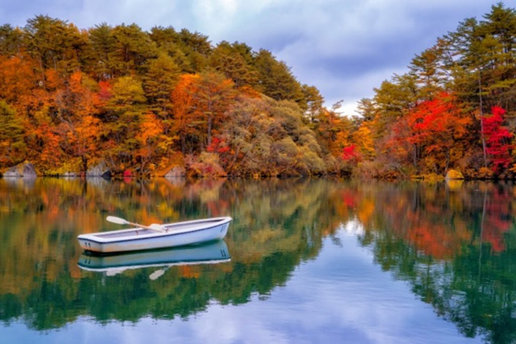 秋の季節には沼の青色と紅葉の赤色が自然のコントラストをうみ、絶景です。