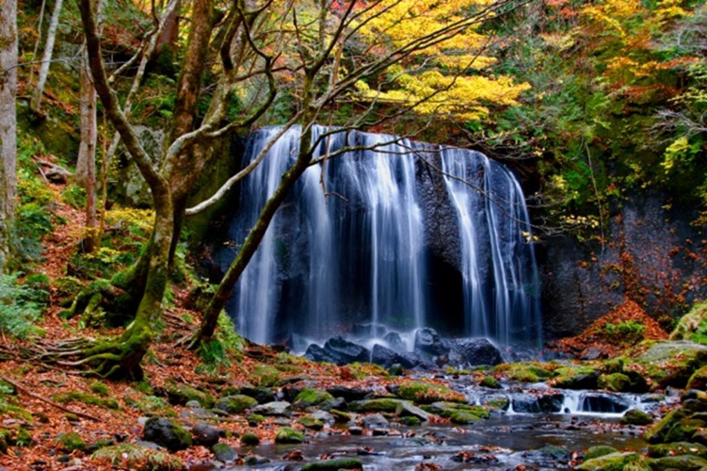 安達太良山系船明神山に源をもつ不動川にかかる滝です。「白虎隊」の悲劇が生まれることになった歴史の道が、滝へ向かう参道入口にあります。高さ10m、幅16mあり、大きい岩肌をカーテンのように豪快に流れる男滝と、その西側にひっそりとある女滝があります。緑、木々に囲まれている神秘的な場所です。秋には滝の周りに紅葉が色づきとても美しいです。