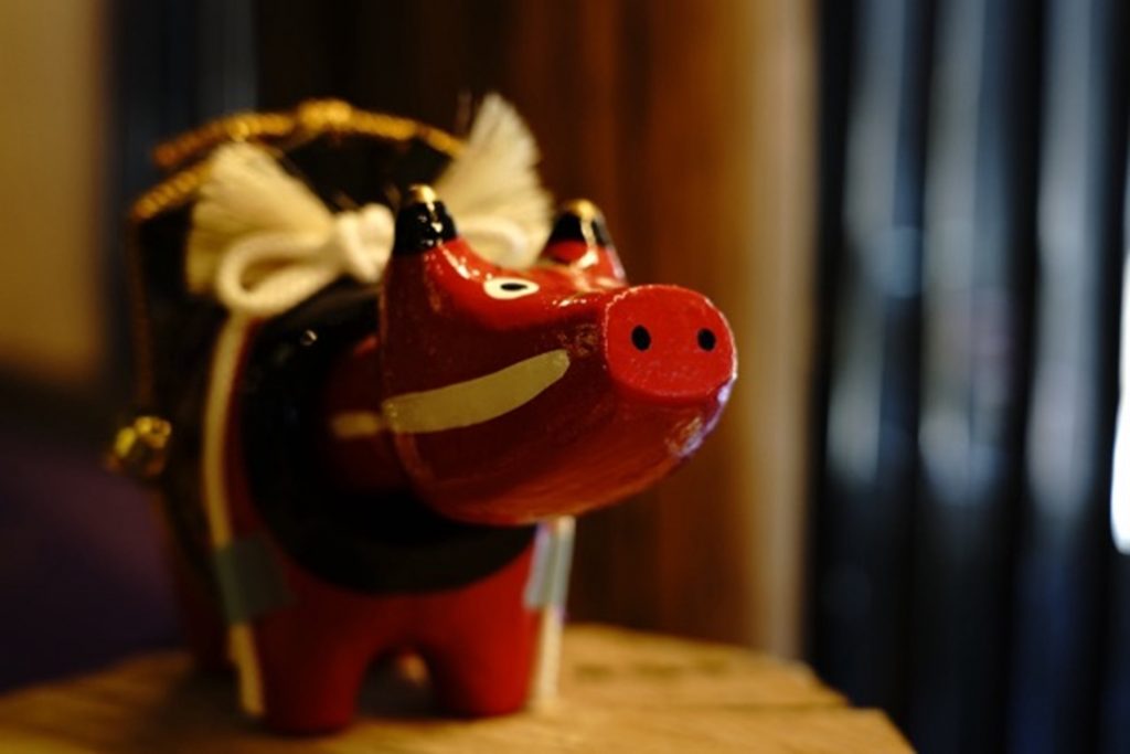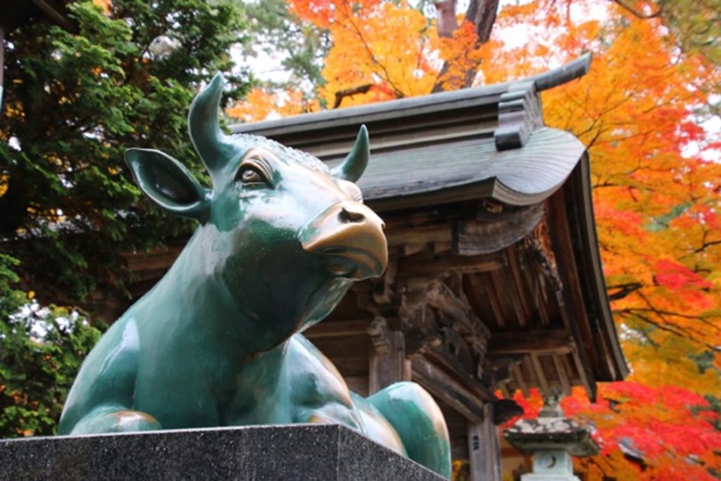 境内にある撫牛像は会津地方の民芸品「赤べこ」(上の写真)の由来となっており、昔から「幸せを運ぶ」と伝えられています。本堂から眺める「庭園・十牛之庭」がとても美しく風情があります。