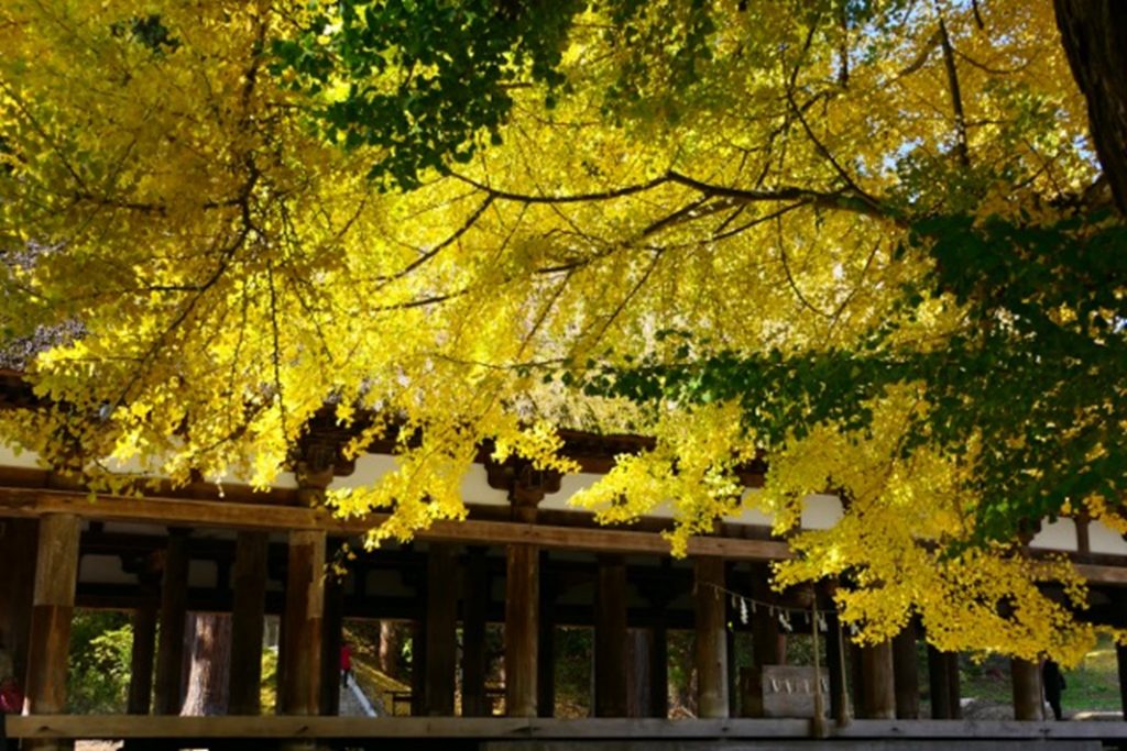 1055年に源頼朝が創建し、古社の拝殿「長床」は平安時代の寝殿造りの建物で国の重要文化財に指定されています。直径1尺5寸(45cm)の円柱44本が等間隔に5列並び、吹き抜けになっています。長床とともに神社の歴史を見守ってきた「御神木の大イチョウ」は高さ30m、根本周りは8m以上あり樹齢800年でとても存在感があります。併設されている「熊野神社宝物殿」には銅鉢や多くの国、県指定文化財があり拝観できます。