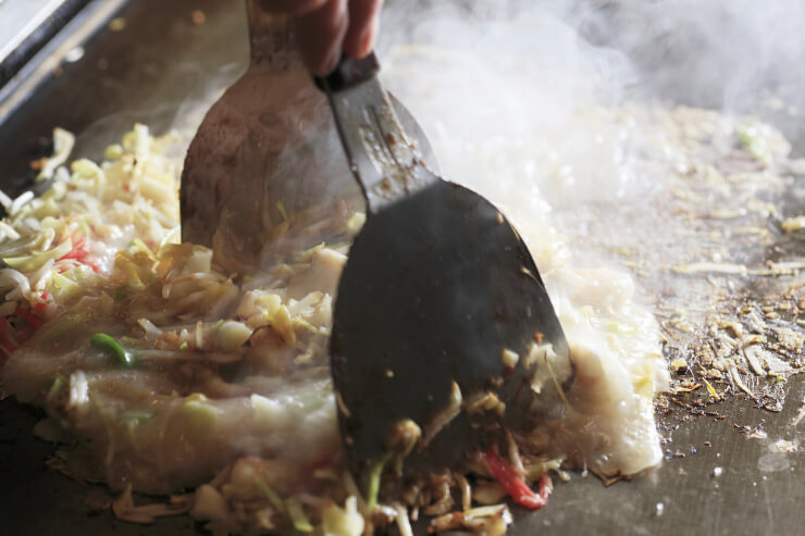 小麦粉やだし、ソースを混ぜて生地を作り、キャベツやいか、あげ玉、桜えびなどの好みの具材をのせて作ります。キャベツは粗めの短冊切りにするのが特徴で、へらで具を細かく切りながら炒めます。