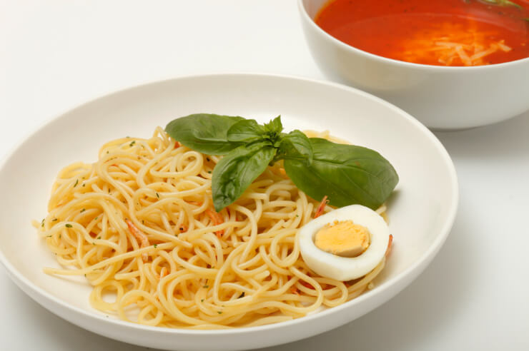 トマトスープをベースに鶏がら・ブイヨンだし、2つのスープを掛け合わせたつけ麺風のナポリタンです。