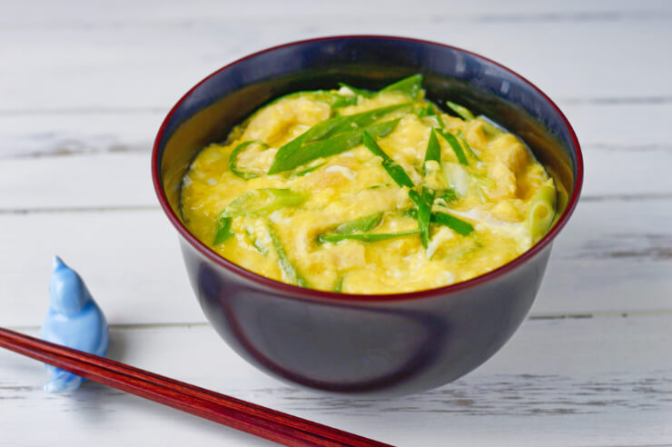 お揚げとねぎが入ったふんわり卵をごはんにのせた、京都発祥の丼です。短冊切りにしたお揚げから甘辛いジューシーなだしが沁みだし、ごはんや卵を包みます。