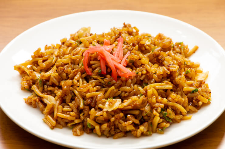 焼きそばの麺を細かく刻んで、ごはんと炒めて作ります。神戸のお好み焼き店では、必ずと言っていいほどメニューにのっている定番料理でもあります。