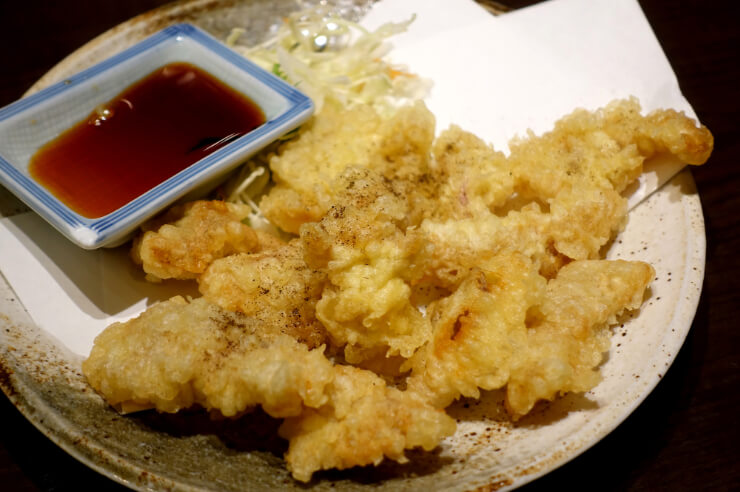 サクサクの衣とコリコリとした食感が心地よく、酢醤油や粉唐辛子をつけていただくのがおすすめです。
