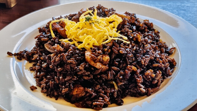 「黒いピラフ」とも例えられる、岡山のご当地グルメのえびめしは、カラメルソースやケチャップ、カレー粉などのスパイスを効かせて作る焼飯です。
