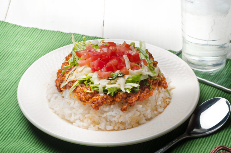 沖縄のソウルフード「タコライス」。一見、海外の料理かと思いきや、タコスとライスをかけ合わせて、味つけしたひき肉(タコミート)とレタス、トマトやチーズをのせた沖縄料理です。