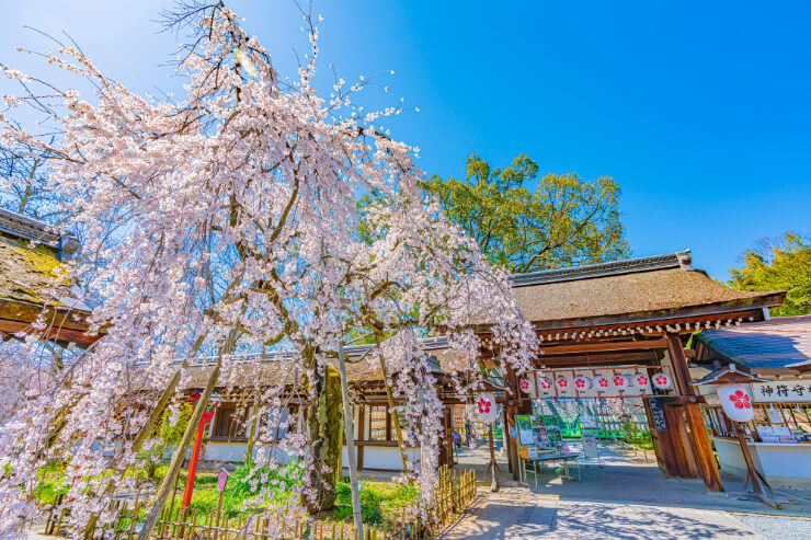 賀茂別雷大神は雷神様の一人で、雷を別けるほどに強い力を持つ神とされていることから、厄除けや災難除け、必勝の神として親しまれています。平野神社からは、タクシーを利用すれば10分ほどの距離に位置しています。