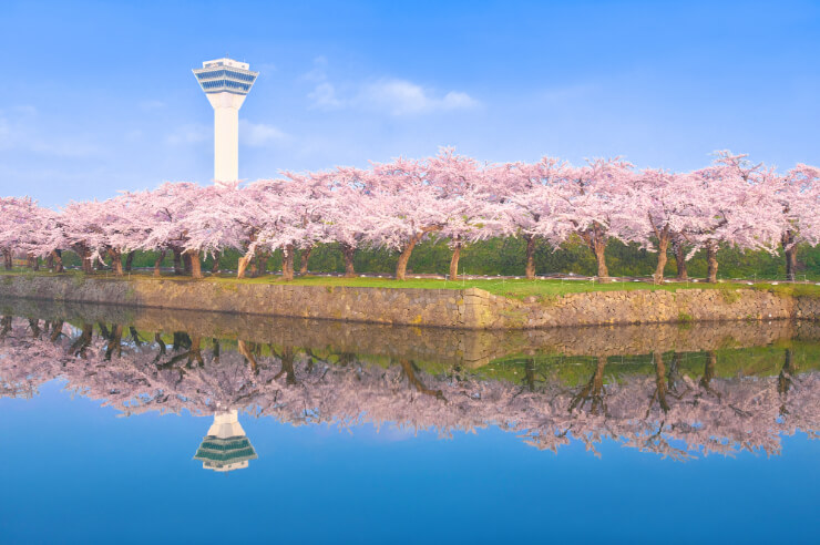 高さ107mの「五稜郭タワー」は、五稜郭を一望するのに最適な展望スポット。展望台に上がると、星形城郭と淡いピンク色の桜がコラボレーションする、他では見られない珍しい風景を楽しめます。しかも函館山や市街地、津軽海峡までもが見渡せ、360度の大パノラマはまさに絶景。展望1階にはカフェスペースもあるので、桜と海、そして函館の街並みを眺めながら一息つく贅沢な時間を過ごせます。