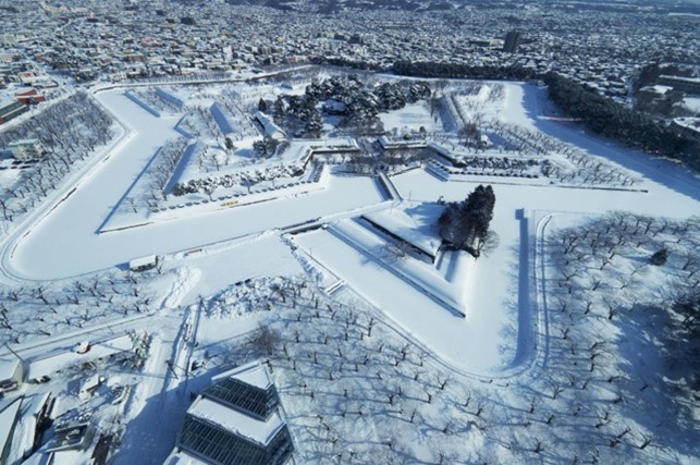 函館港が開港し、外交をつかさどる箱館奉行所として、1864年に「五稜郭」が建てられたと言われています。1914年から「五稜郭公園」として一般に開放され、春は桜の名所でもあります。