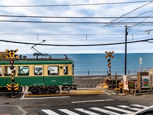 江ノ電の歴史は、1902年に江之島電気鉄道(現 江ノ島電鉄株式会社)が開業し、東海道線の藤沢停車場と江の島を結ぶ藤沢〜片瀬間でした。1903年に線路が伸び「日坂駅」の名で開業し、1953年に今の「鎌倉高校前」と改称されました。江ノ島と富士山、そして江ノ電を同時に見ることができ、最高の景色が見れます。人気のアニメ「スラムダンク」のオープニングシーンに登場する踏切が鎌倉高校前駅から七里ヶ浜方面に100mほど歩いたところにあり、人気のスポットです。