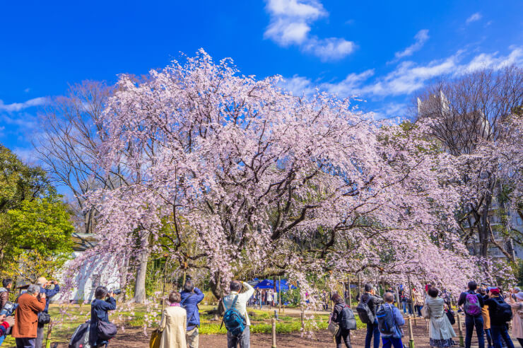 六義園は、江戸時代に第5代将軍・徳川綱吉の側用人、柳澤吉保によって造られた日本庭園で、国の特別名勝に指定されています。この庭園の象徴ともいえる高さ約15m、幅約20mのシダレザクラは、まるで滝のように流れ落ちる花の美しさで訪れる人々を圧倒します。