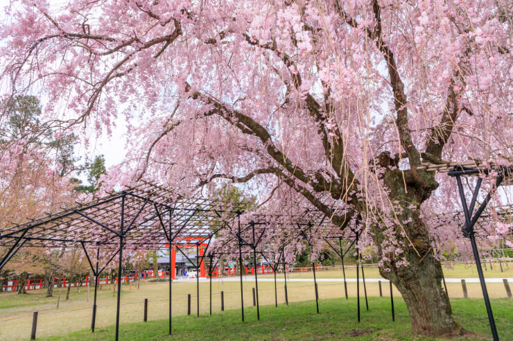 ユネスコの世界遺産「古都京都の文化財」に登録されているだけでなく、国宝2棟、重要文化財41棟が境内に点在。春の桜と相まって、長い年月を経て培われた“和の心”を存分に味わえるのが、この神社ならではの大きな魅力です。