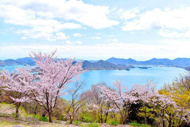 春には約2,000本のソメイヨシノが咲き誇り、桜越しに眺める瀬戸内海の多島美は圧巻です。特に山頂の展望台からの眺めは、瀬戸内海随一の美しさと評価されるほどで、訪れる価値があります。南西に位置する竜王山の桜並木も見事で、晴れた日には四国山地やしまなみ海道の7つの橋を一望できます。
